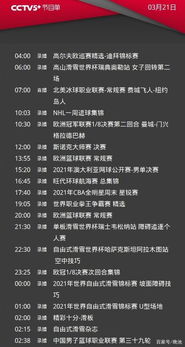 CCTV5+将录播高尔夫欧巡赛、高山滑雪世界杯、NHL一周进球集锦、斯诺克大师赛、欧冠、欧洲篮球联赛常规赛、澳网男单决赛、旺代环球航海赛、CBA、单板滑雪世界杯、自由式滑雪世界杯、滑板等比赛和节目。