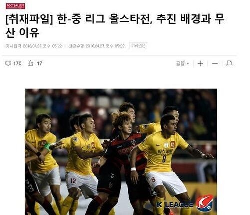 韩国媒体的文章中表示,K联赛和中超联赛在今年夏天进行全明星赛的提议上没有可以达成一致,韩国K联赛联盟事务局长赵延相对记者表示,中超和K联赛双方理事会原则上同意进行中超和K联赛的全明星赛,但是中国以全明星赛和世界杯最终预选赛只相隔一个月、全明星赛对国家队的备战有影响为理由,最终表示了拒绝。