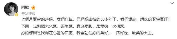 阿雅和大S是华冈艺校的同学,从学生时期就互相扶持,和出演过实境秀《我们是真正的朋友》,对于好友突然骤逝,阿雅难过表示:「上个月聚会的时候,我们在算,已经认识彼此30多年了,我们还说,姐妹的聚会真好! 下回一定别隔太久聚,要常聚。 真没想到,是最后一次相聚。 你的离开是我刻在心里的哀伤,我会记住你的美好。 一路好走,最美的大王。」