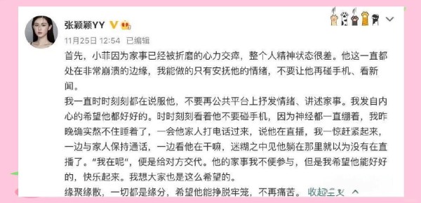 张颖颖透露,汪小菲因家庭事务而备受煎熬,精神疲惫不堪,时常处于崩溃的边缘。她尽自己所能去安抚他的情绪,甚至不让他接触手机以免受到外界新闻的干扰。