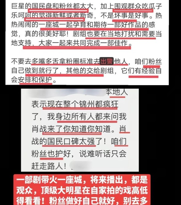 肖战一到锦州,现场立马沸腾了,大家都变成了吃瓜群众,东北人的热情真是豪放直接!辽宁锦州因为肖战的到来简直像开锅似的,所有人都像开水壶一样躁动!很多人都不做生意了,纷纷跑去看肖战的动态!感觉整座城都在刷肖战的视频,绝对是像掷果盘一样的火爆,评论区全都是“那可是肖战啊!”有人说:“东北追星的不多,没有哪个剧组像肖战这样,被这么围观,就只有他能做到。”东北网红那么多,但东北人对人的热情,跟追星的热情还是不一样的。