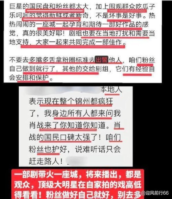 不过面临这样的场面,肖战的粉丝群俨然展现出了惊人的“人群驾驭技能”。一开始我还真担心,这么多人蜂拥而至,会不会现场太混乱呀?结果发现肖战粉丝们果然都是“神仙粉丝”。他们不仅表现出极大的理性,还主动告诫同好别让追星的行为违背当地群众的日常。大家都说,“锦州的老百姓围观不是坏事,闹闹腾腾能带动作品火,咱们粉丝自己遵守规则就行,剩下的交给专业的剧组来处理。”
