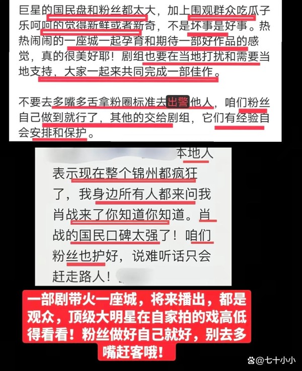 有大明星在我家旁边拍戏我也肯定去看看热闹,很正常一件事。看热闹的百姓不同于私生代拍。”有锦州的朋友说“我朋友同事不追星,但全都去了,在门口等了好几个小时,大家边拉家常边等肖战,东北人就是爱凑热闹,拍没拍着不重要,要的就是这个氛围,图的就是这个热闹!”肖战国民口碑太牛了!一部剧带火一座城,欢迎热情市民口口相传我们《小城良方》!在这里也呼吁锦州的朋友们咱们一定注意安全!巨星虽好看,安全第一位,预祝小城良方拍摄顺利,明年咱们一起看好剧!