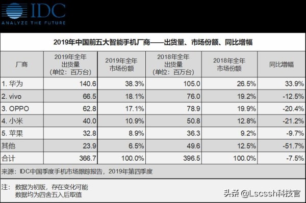 目前,IDC给出了2019年全球手机销量以及中国手机市场销量,华为全球为2.4亿排名第二,市场份额为17.6%;中国市场销量为1.4亿,排名第一,市场份额为38.3%。由此可以看出华为手机海外销量大概在1亿左右。