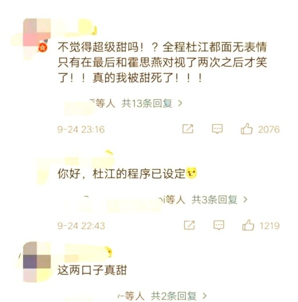 然而,在之后的 对唱环节中,两人的互动却显得格外甜蜜。尽管杜江在唱歌时一直保持着面无表情的状态,但当他的目光与霍思燕相遇,并牵起她的手时,他的神情终于松弛下来,露出了微笑。
