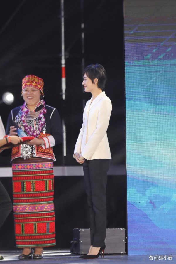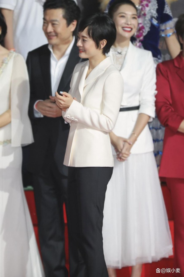 一头精神又干练的短发,白色西装配西裤,她不像是一个演员了,倒是比马云还像一个企业家。