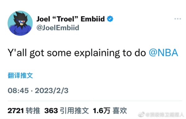 队友恩比德非常不满,直接发推艾特了NBA官方社媒:“出来解释解释。”