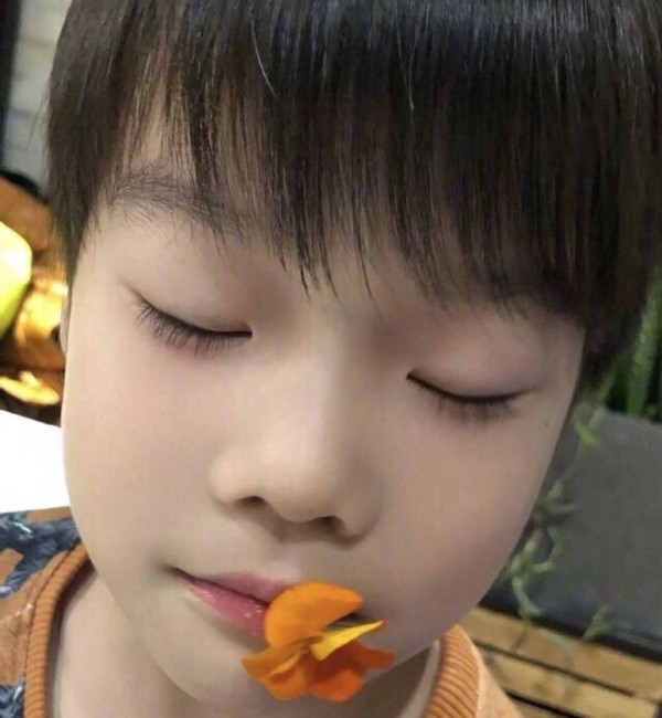 一张照片是正面照,照片中的吴所谓闭着眼睛,眼睫毛又长又浓密,嘴巴里叼着一朵橘黄色的小花,刘海长到了眉毛,皮肤白皙,就像一个漂亮的女娃娃。
