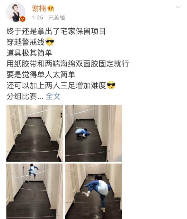 比如上个月,谢楠就晒出了他们家的“宅家游戏”—穿越警戒线,并晒出了吴所谓兴致勃勃地玩游戏的照片。