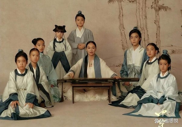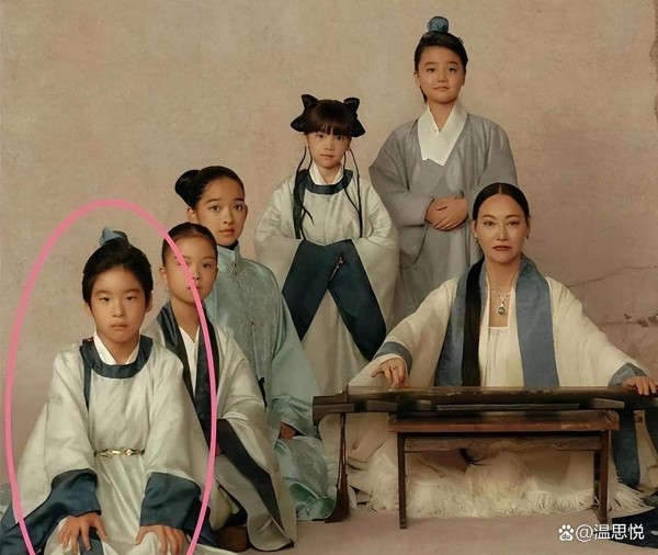吴虑站在惠英红旁边,穿着小汉服,手放在膝上。