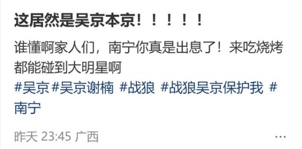 吴京在吃烧烤时有很多网友都认出了他,不过周边路人并没有上前要合影,吃完烧烤后被老板和一众助理一路护送。