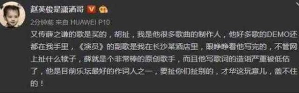作为薛之谦十年好友的赵英俊,立马就在微博上进行了反击:薛之谦跟我合作了很多年了,他的大部分歌曲都是我都有参加。那一首所谓抄袭的《演员》,我亲眼看着他填完了所有的词。想要黑他得要事实,本身的才华还是不容置疑的。音乐是音乐,别拿来随便开玩笑。
