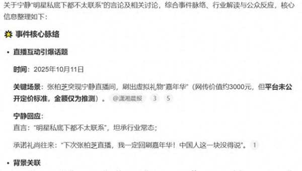 宁静在直播间坦言明星私下几乎不联系,三千块礼物砸不出真友情,引发网友对娱乐圈人情冷暖的大讨论