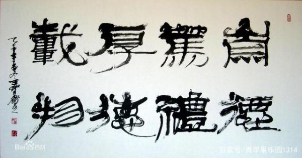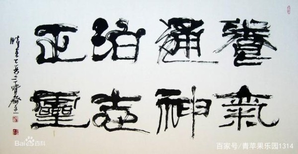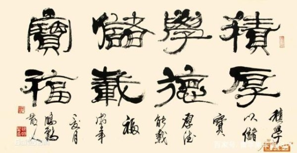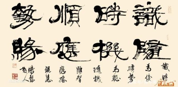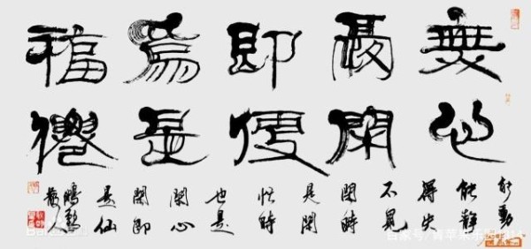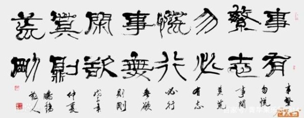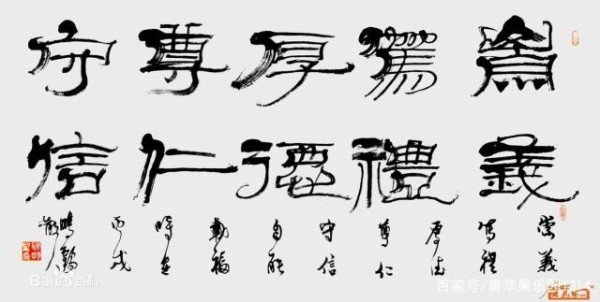 其一是“隶取汉代为法”:以汉碑作基本架构,溶篆、简、帛、行等多种汉代字法和笔法于一体,强调线条的内涵和线形的多样,力求端稳不失灵动,丰富不失谐调。