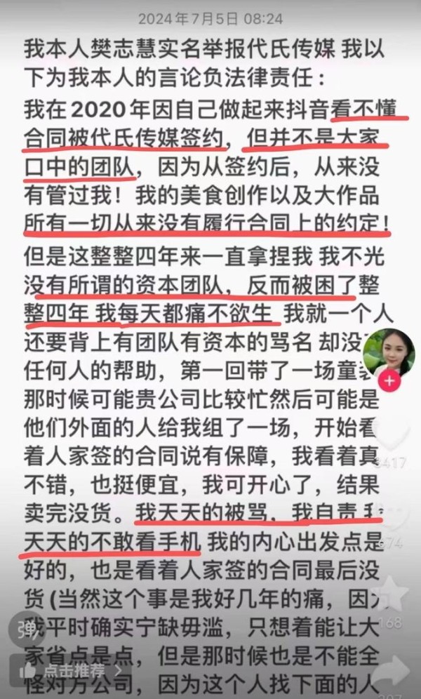 随后,代勇还曝光了两个人之间的聊天记录,樊小惠的人设也再次崩塌。原来,樊小惠起初和粉丝说自己是没有团队的,但这次事件之后,最先拆穿的就是没有团队这个谎言。她不仅有自己的团队,还和代世传媒签订了合约,樊小惠自始至终都在欺骗她的粉丝。