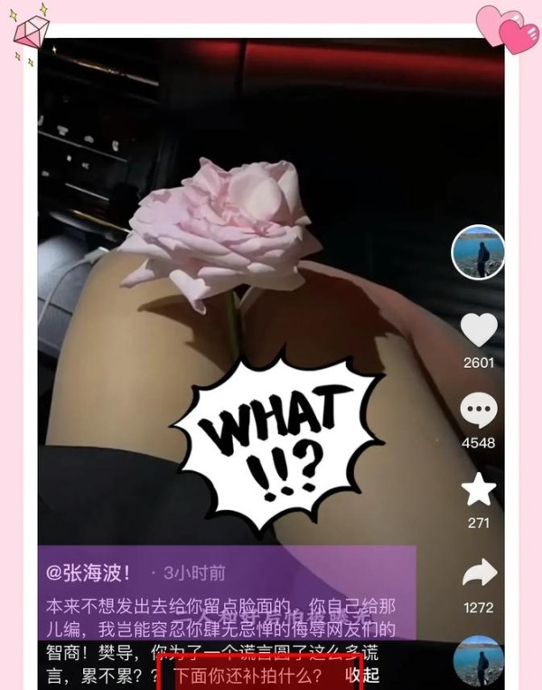 张海波可不是好惹的主。他在3个多小时后就发文反击,指责樊小慧在撒谎。他还晒出了两段视频,声称这是樊小慧一年后补拍的。张海波细心地指出,两个视频里摄影师的头发长短不一,连鲜花都不一样,这不是明摆着在演戏吗?