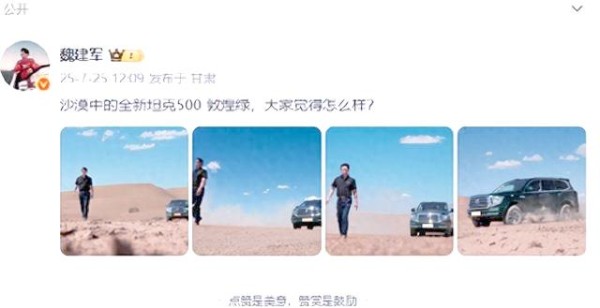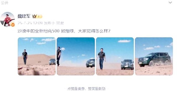 沙漠的风依旧吹拂,敦煌绿的车身在阳光下熠熠生辉,魏建军的微博下,赞美的声音与调侃的言论交织。有人戏谑道:“下次是不是该考虑把健身房移到沙漠里去了?”也有人质疑:“这究竟是产品发布会,还是一场老板的个人秀?”