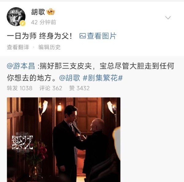演员胡歌晒出了和老戏骨游本昌的合照,一日为师,终身为父!