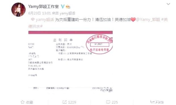 紧接着前日的平安报喜,6月23日,Yamy便通过个人工作室公布了一张捐款账单,上面显示她向故乡清远市和英德市捐赠了10万余元,以实际行动支持抗灾救灾工作。这一举动展现了她的善良与正能量,赢得了粉丝们的广泛赞誉。