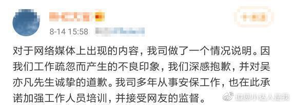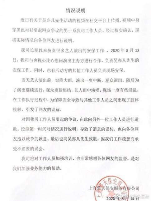 随后很快,安保公司在微博上发表回应,他们就是负责吴亦安全工作的公司。声明说,因为大雨打断演唱会,现场混乱,保安为了安保工作与其他工作人员身体接触以确保安全,造成误会,未能立即说明情况,导致不实消息,向吴亦凡和网友表示歉意。