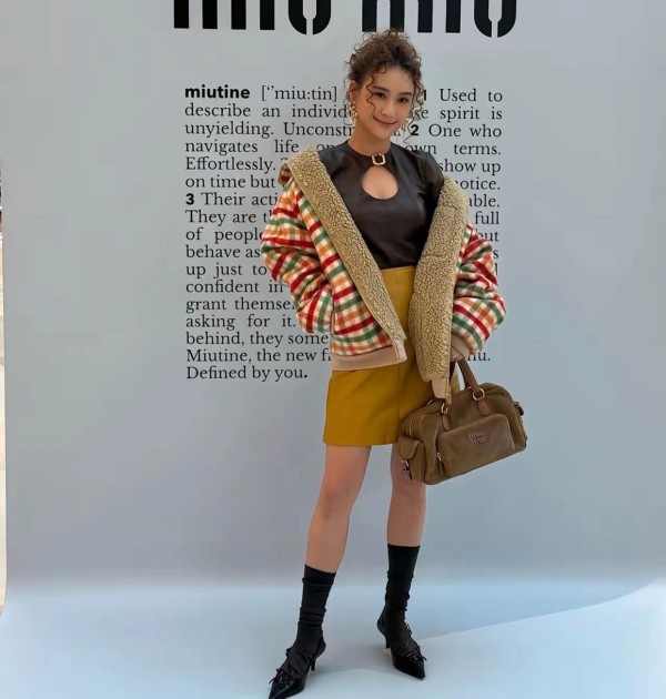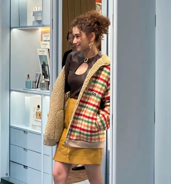 她身穿一件格纹休闲外套,内里是保暖的颗粒绒材质,兼顾时尚感与实用性;内搭的黑色打底衫暗藏巧思,领口的镂空设计增添了几分小性感,女人味十足。