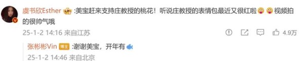而张彬彬,这位集颜值与演技于一身的青年演员,面对虞书欣的夸赞,还特别用了小鱼的表情包来回应。这样的回复,既展现了他幽默风趣的一面,又巧妙地回应了虞书欣的夸奖,让人感叹:张彬彬,你可真是个宝藏男孩!