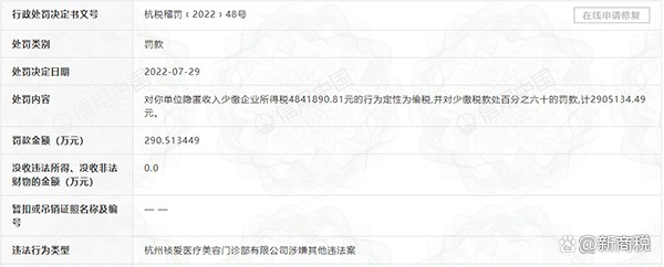 9月初,天眼查更新了一则关于杭州祯爱医疗美容门诊部有限公司(以下简称A公司)的行政处罚决定书,原来是该公司因隐瞒收入近5亿元,偷税484万元被处以290万余元罚款。
