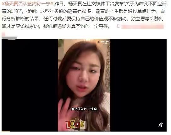 几天后,杨天真特意发了一段视频澄清和回应,虽然没有指名道姓,但言辞间说的应该就是“签约孙一宁”的这一猜测。