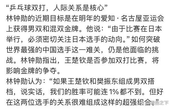 2025年7月25日,刚拿下美国大满贯男双冠军的韩国选手林钟勋,在《首尔新闻》专访中曝出一个观点:“如果王楚钦和樊振东搭档男双,我们的胜率可能连1%都不到。 ”他紧接着补充:“好在他们俩私下关系并不好,这种怪物级组合很难成型。 ”他甚至宣称,两人在巴黎奥运会时就因男单争冠关系紧张,“赛前都不一起训练”。