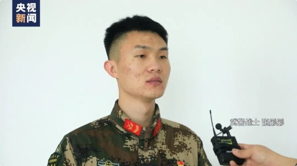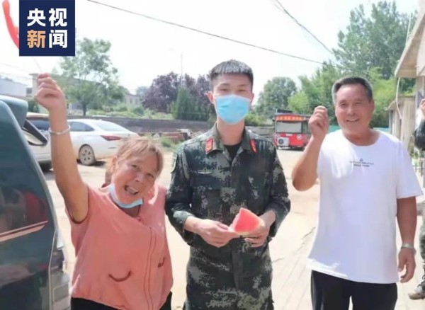 △ 2021年,在河南巩义市米河镇抗洪一线,张彤彤(中)与当地老百姓合影。