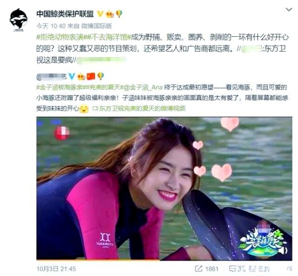 除了网友们的质疑,中国鲸类保护联盟也连续发文对吴宣仪和节目组提出严厉批评。该联盟强调:“参与野捕、贩卖、圈养或剥削野生动物的活动,有什么值得开心的呢?这种既恶劣又愚蠢的节目策划,希望艺人和广告商能保持距离。”同时,他们还揭露这些鲸类动物均来自日本血腥的海豚湾。从保护联盟的言辞中可以看出,他们对节目组的这种行为深感反感,认为节目组实际上在助长猎捕者的不当行为。