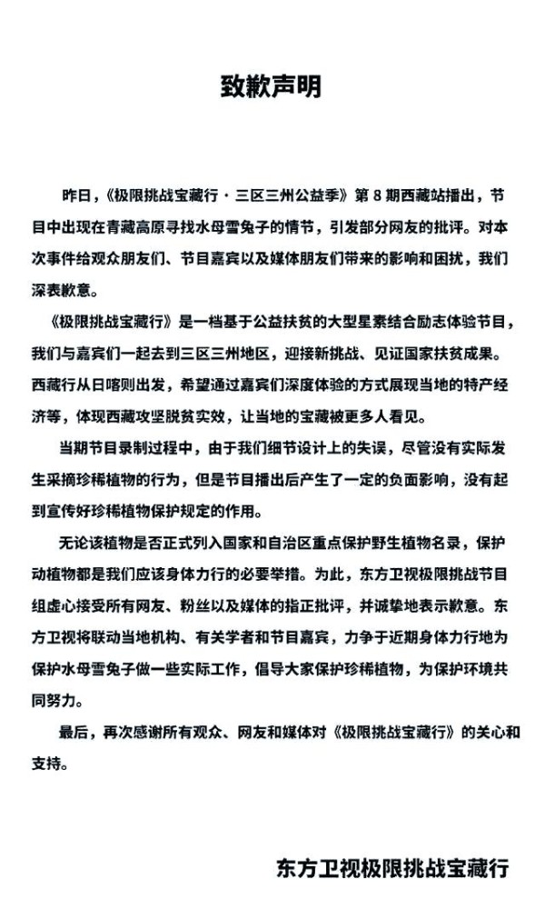 在《极限挑战》的一期节目中,俞灏明、刘宇宁、岳云鹏三位艺人共同参与了雪山寻宝的环节,最终由刘宇宁亲手采摘了所谓的“雪莲”。然而,在刘宇宁晒出采摘成果的照片后,网友们发现,这并非真正的天山雪莲,而是珍稀的国家二级保护动物——水母雪兔子。这一发现立刻激起了广泛的争议与批评,东方卫视也为此不得不公开发表致歉声明。