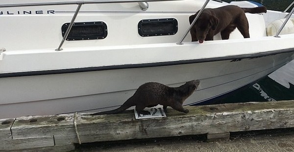 逗趣十足!美好奇水獭与拉布拉多犬水边嬉戏