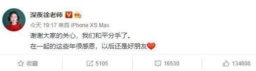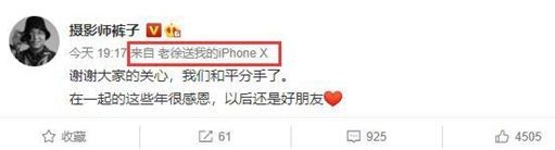 裤子也宣布分手,一模一样的文案。关键处,落在了“老徐送我的某手机”。用前任女友送的手机,发出分手的微博说明——你说,这到底是残忍还是讽刺呢?实际上,徐老师与裤子在一起很多年了。我也懒得保守估计,因为人们还以为他们早已结婚。毕竟,网络有着太多的甜蜜照片、恩爱证据。他们的确是关系非常好的情侣,怎么突然间分手?还能做回好朋友,应该与第三者没有关系。