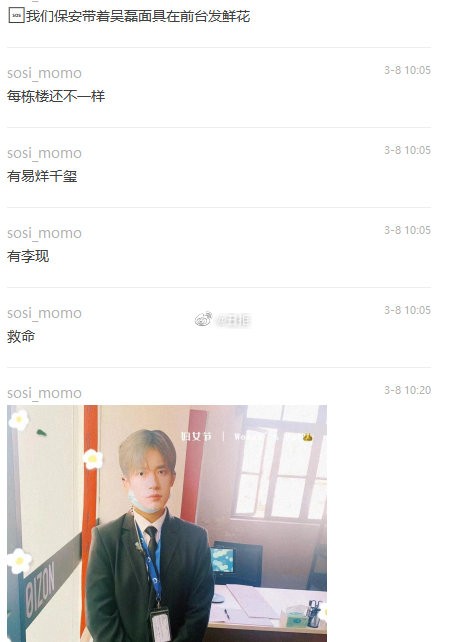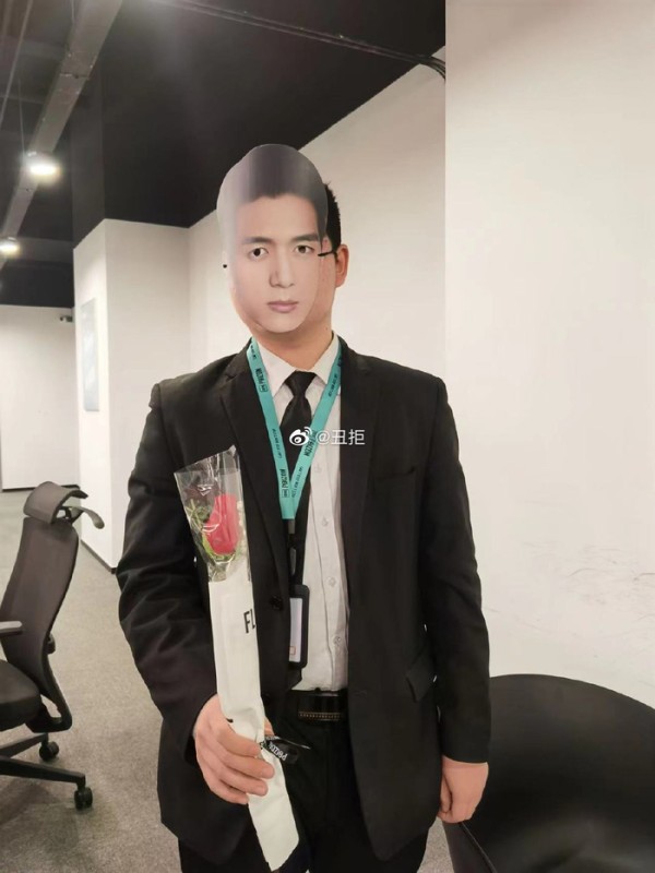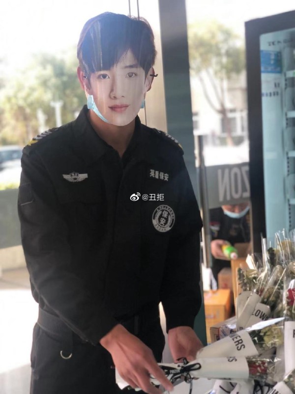 有网友分享公司的 福利:保安带着男明星面具给大家发鲜花有带着吴磊的,有带着易烊千玺的,有带着李现,还有带着王嘉尔的