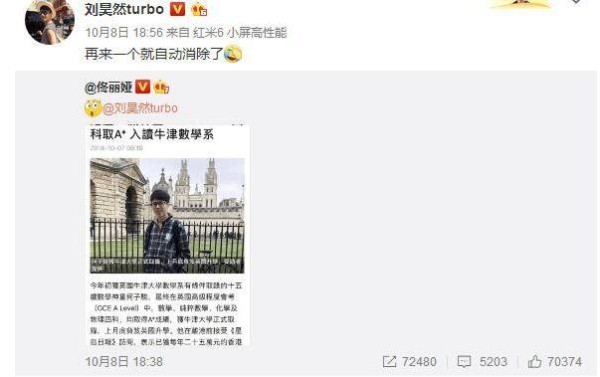 10月8日 佟丽娅在微博晒出了一张截图,图片中香港15岁的神童与刘昊然五官神似,佟丽娅因此艾特了刘昊然,对此调侃了一番。