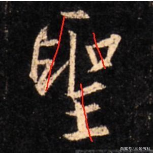 再来看这个“宣”字,这个字在结构上是错位的,并没有写的左右上下各均等,“宝盖旁”欧阳询处理的左低右高,将整体的字势拉像左边,为了平衡的这种态势,下面的笔画,再像右方偏移,这种造险的特点,被后世欧阳询学习的淋漓尽致,这种造险和平险的方式,在欧楷楷书中甚为常见。