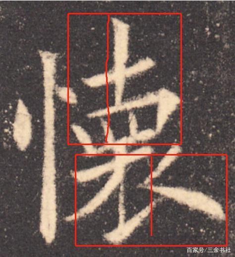比如这个“怀”字,右边的上下结构在处理的时候同样采取了这样的错位,用笔法将上部分的重心偏移,然后通过下半部分的重心偏侧来平险。这也是为什么欧楷被称为险绝的原因!