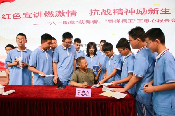 9月15日上午,“八一勋章”获得者、导弹“兵王”王忠心受邀来到黄山新教育学校,为七年级400多名新生上了一堂震撼人心的国防教育课。