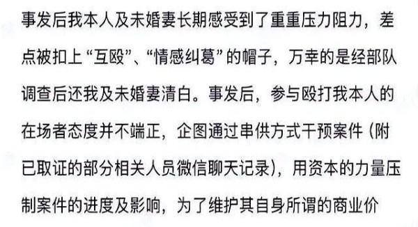 忍无可忍后,梁先生以普通网友身份曝光整个过程,结果引出更多当晚在场者和幕后操作——有人试图把这起群殴说成“互相扭打”,有人散布当事人情感不和的说辞,甚至有人提到会不会牵扯军方。