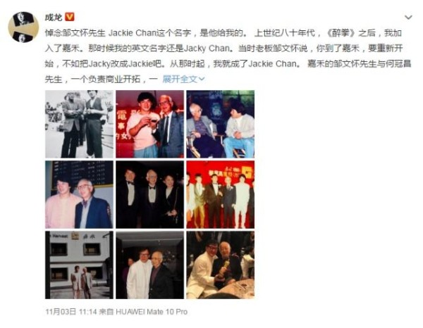 据11月3日成龙微博发文,除了表示对邹文怀的逝世深感惋惜,还回忆起了往日相处点滴,包括邹文怀建议成龙把Jacky改成Jackie,以及当年在南斯拉夫拍戏脑部重伤,受邹文怀联络医生帮其做手术,救回了一命,可谓是救命恩人。在文中还表示,邹文怀先生对成龙来说,是老板、前辈、师长,是永远尊敬的行业楷模,对整个香港电影乃至华语电影来说,他邹文怀是一个时代的烙印。
