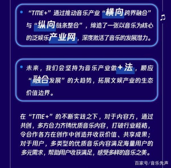 正如潘才俊在发布会上说的:“TME+”通过推动产业‘横向跨界融合’与‘纵向链条整合’,缔造了一张以音乐为核心的泛娱乐产业网,深度激活了音乐的发展潜力。”