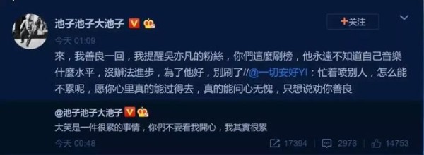 后有池子精准定位,不仅在节目上频频吐槽新生代老炮,又微博上怒怼梅格妮刷榜。(详情回顾:这位勇士,说出了路人一直不敢说的话)