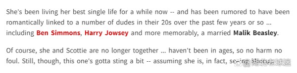 媒体还爆料,这已经不是拉尔萨第一次约会年轻的男孩子。她似乎对于NBA球员与篮球运动员格外青睐,在她的绯闻男友名单之中,还有本-西蒙斯(篮网队,前NBA状元)、马利克-比斯利(已经被交易到犹他爵士)。此外,她还与白人男明星哈利-乔西(Harry Jowsey)传过绯闻。由于哈利的女友大多年龄较大,他的粉丝已经见怪不怪了。