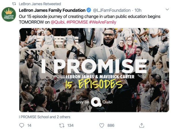 然而仅仅过去一天,勒布朗的公司就宣布了新消息:他们拍摄制作的关于“我承诺”学校的纪录片将于4月6日上线播出。