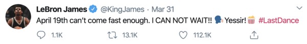 勒布朗当时写道:“4月19快点来吧,我等不及了!太棒啦!#最后一舞”