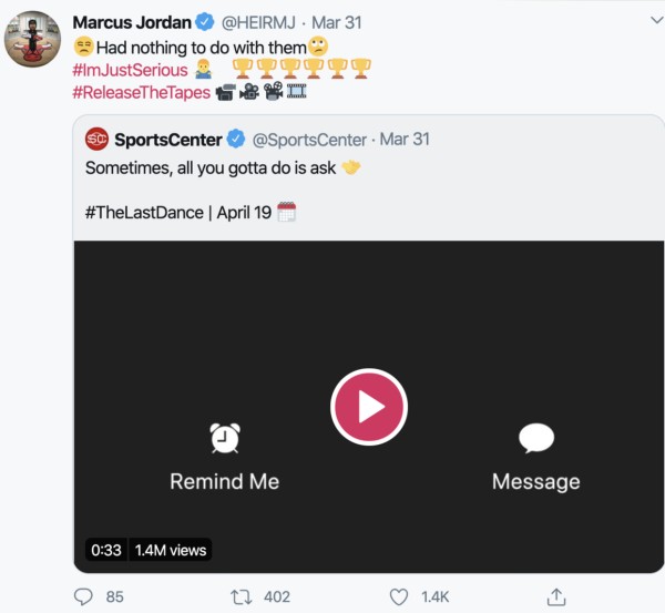 就在勒布朗与杰弗森讨论乔丹纪录片引发球迷热议、ESPN官号也转发他俩的直播视频时,乔丹次子马库斯站出来泼冷水了。