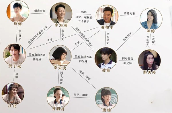 从图中我们可以看到,三个主演之间的关系还是比较复杂的,尤其是他们的父母之间。李海潮的相亲对象是贺梅,而贺梅是贺子秋的妈妈;另外陈婷后来改嫁了,她还有一个亲生女儿叫秦美央,凌霄跟秦美央是同母异父的兄妹,至于父亲凌和平,在剧中暂时是没有感情线的,他是贺子秋跟李尖尖的干爹。