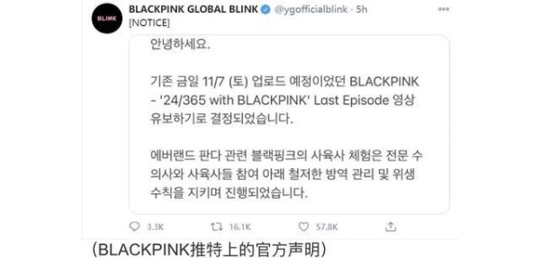 11月7日,“爱宝乐园”动物园和BLACKPINK的官方社交媒体对此事进行了回应。声明的内容主要分为两部分内容:1.决定不播出原定于今天(11月7日)播送的完整版节目视频,原因是由于“非专业人士与熊猫的接触行为,会从一些角度引起误会”,所以根据熊猫专家的建议,在尊重国际合作惯例的前提下,决定不播出这一期的完整节目;2.声明再次强调,这次艺人与熊猫的接触,都是在专业人士的参与下,严格遵守防疫管理和卫生规范进行的,每次切换场景时,都会再次消毒。该声明里并未对被质疑的带浓妆接触大熊猫,以及团体成员家中养宠物等细节发表回应。
