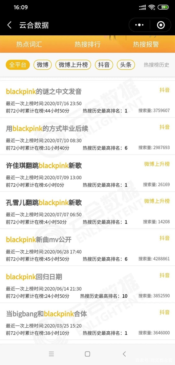 截止2020年7月28日,BLACKPINK(根据团名及成员名字搜索)已经在微博上过169次热搜,无论是新专辑发布还是一个普通的打歌舞台,甚至是和别人撞脸都能冲上热搜的第一位,TOP女团似乎受到了全方位的关注。